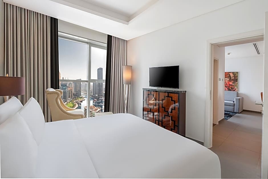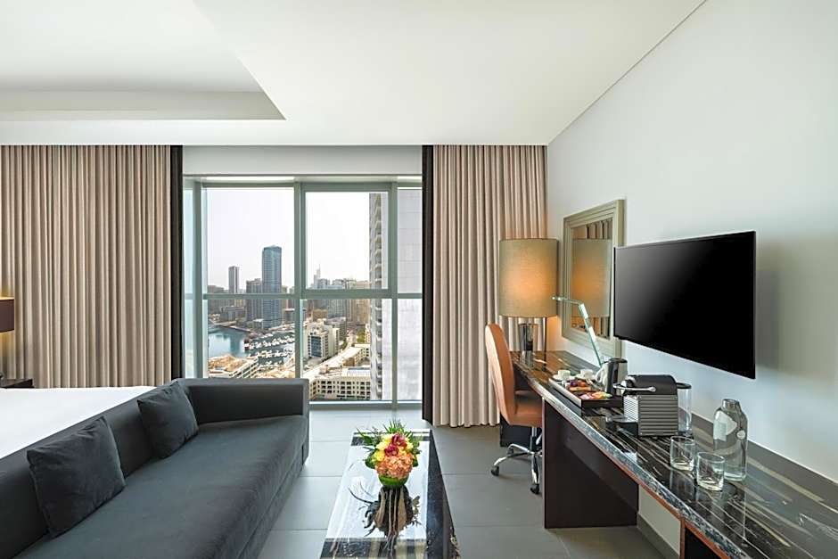 Located on the upper floors, this spacious 35 sqm nonsmoking One-Bedroom Club Suite features a comfortable king-size bed, a separate living room with a convertible sofa bed and large windows that offer partial Marina views. Enjoy amenities such as tea-making facilities, a coffee machine and complimentary seamless high-speed WiFi. The bathroom is equipped with a bathtub and eco-friendly products for your indulgence. Chromecast is available to elevate your entertainment experience. Guests staying in the One-Bedroom Club Suite enjoy exclusive access to the Club Lounge.